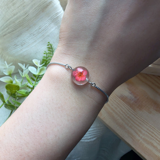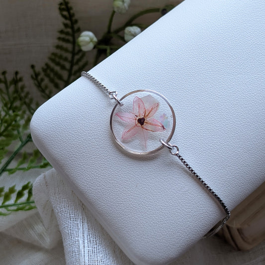 Platinum Plated Pink Chive Blossom Bracelet with Seashell Flakes | Real Flower Jewellery | Work by Nature