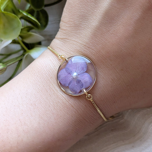 Gold Plated Purple Hydrangea Bracelet with Imitation Pearl | Real Flower Jewellery