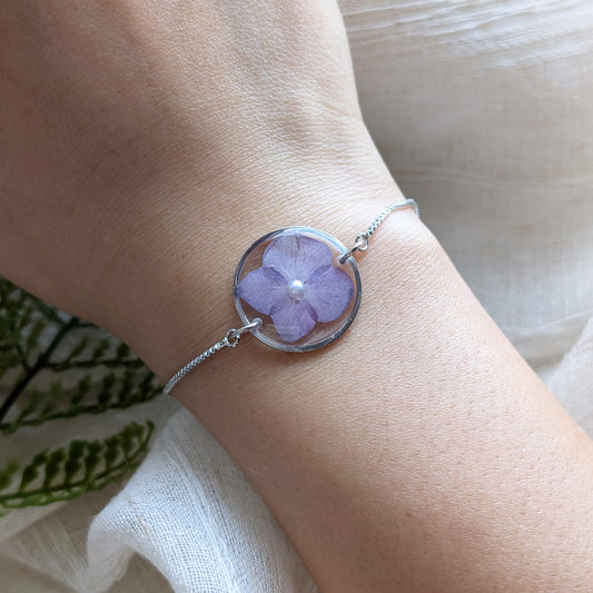 Platinum Plated Purple Hydrangea Bracelet with Imitation Pearl | Real Flower Jewellery