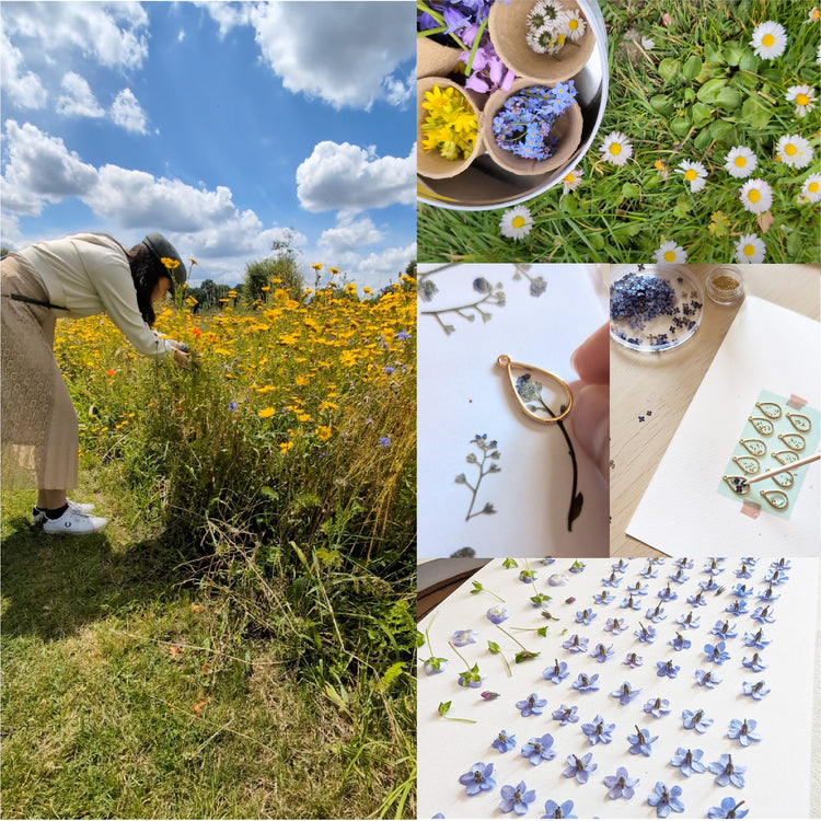 This collection features nature jewellery crafted from real flowers sourced in St Albans and West London. I handpick flowers from the meadow or my own garden, press them for 2 months, and use them in my handcrafted resin art jewellery.