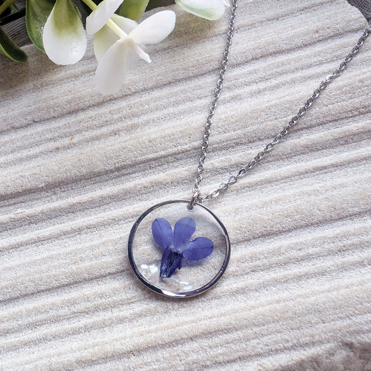 Harmony Blue Lobelia Necklace with Seashell Flakes | Platinum Plated Real Flower Jewellery