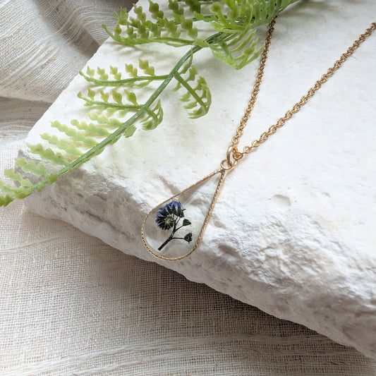 Gold Plated Light Blue Forget Me Not Teardrop Pendant Necklace
