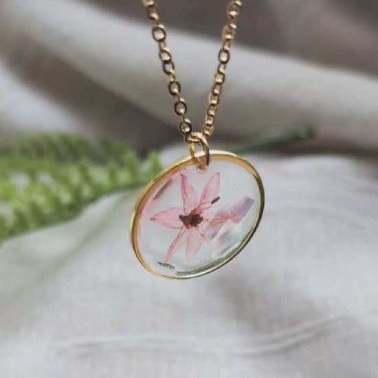 Handcrafted by Fiona of Work by Nature, this flower necklace showcases a light pink chive blossom accented with delicate, subtle seashell flakes. Chive blossoms symbolise practicality and usefulness, making this piece as meaningful as it is beautiful. Each bloom is preserved in UV resin and set in gold-plated elegance, capturing the soft charm of nature in jewellery form. Made by a UK women-owned business, it blends real flower craftsmanship with timeless style. Perfect for nature lovers and admirers of nature inspired jewellery UK, it’s a thoughtful gift for her or gift for gardener, and a graceful addition to any subtle jewellery collection.