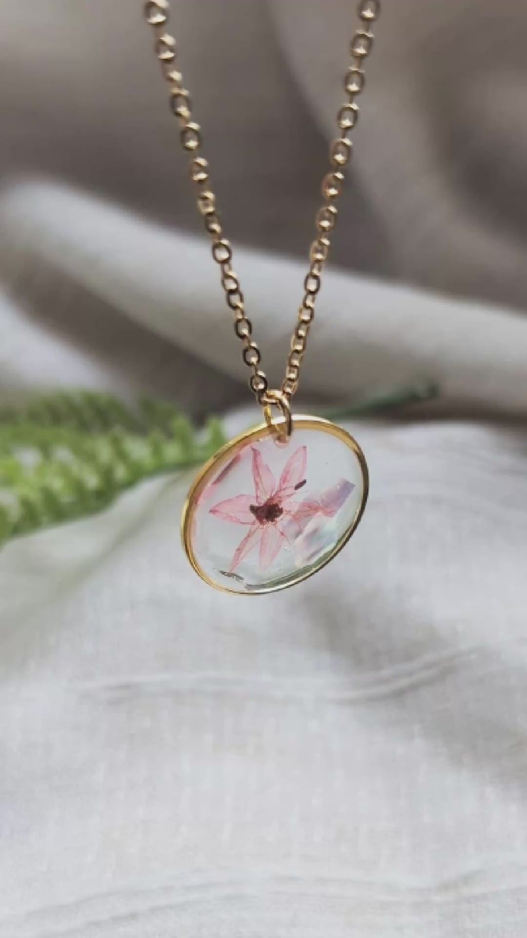 - Pendant Material: UV resin,Pink Chive Blossom, 18K Gold Plated brass